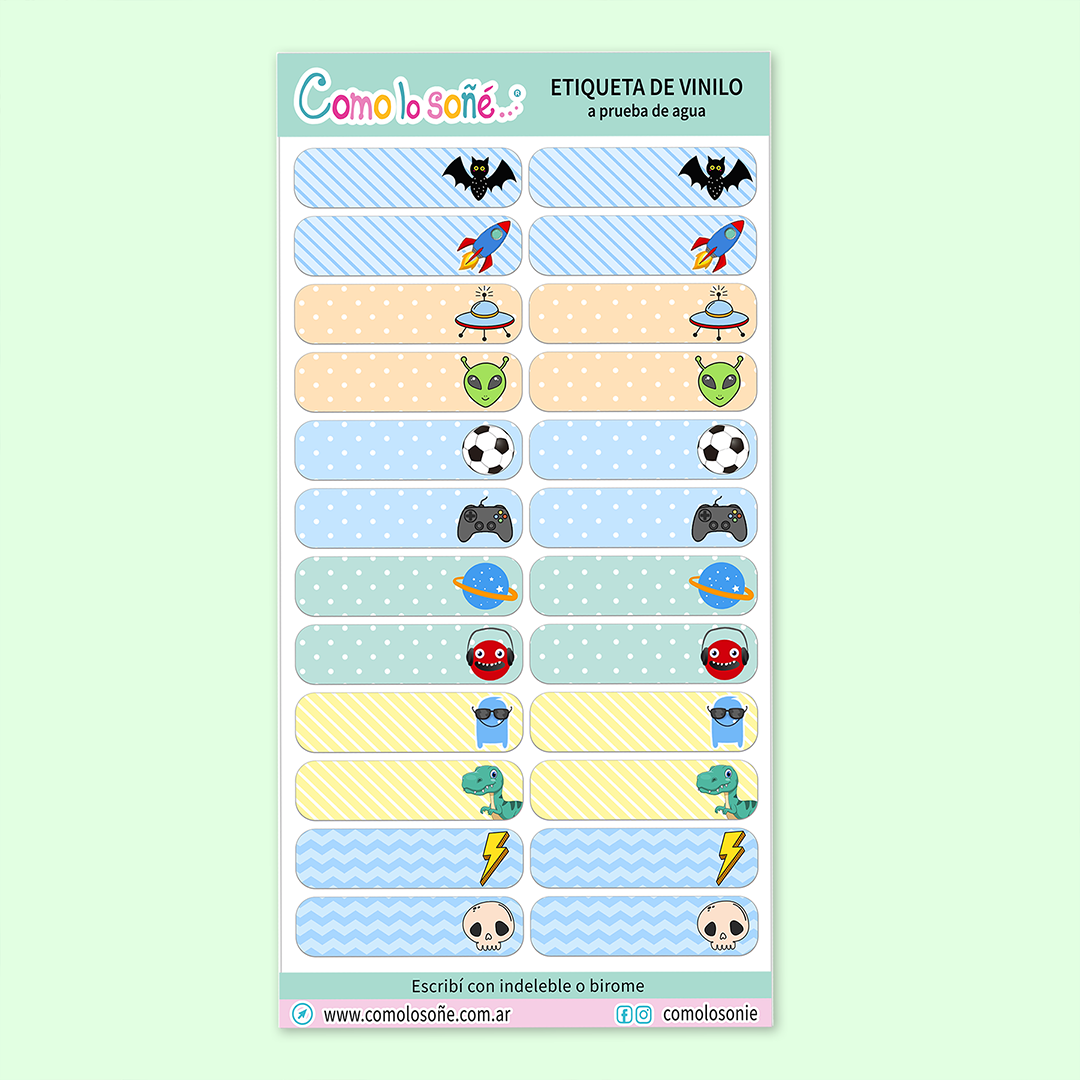 24 etiquetas vinilo autoadhesivas (4,4 x 1 cm) fondo estampado con dibujos. Para útiles, lápices, tapers y más.