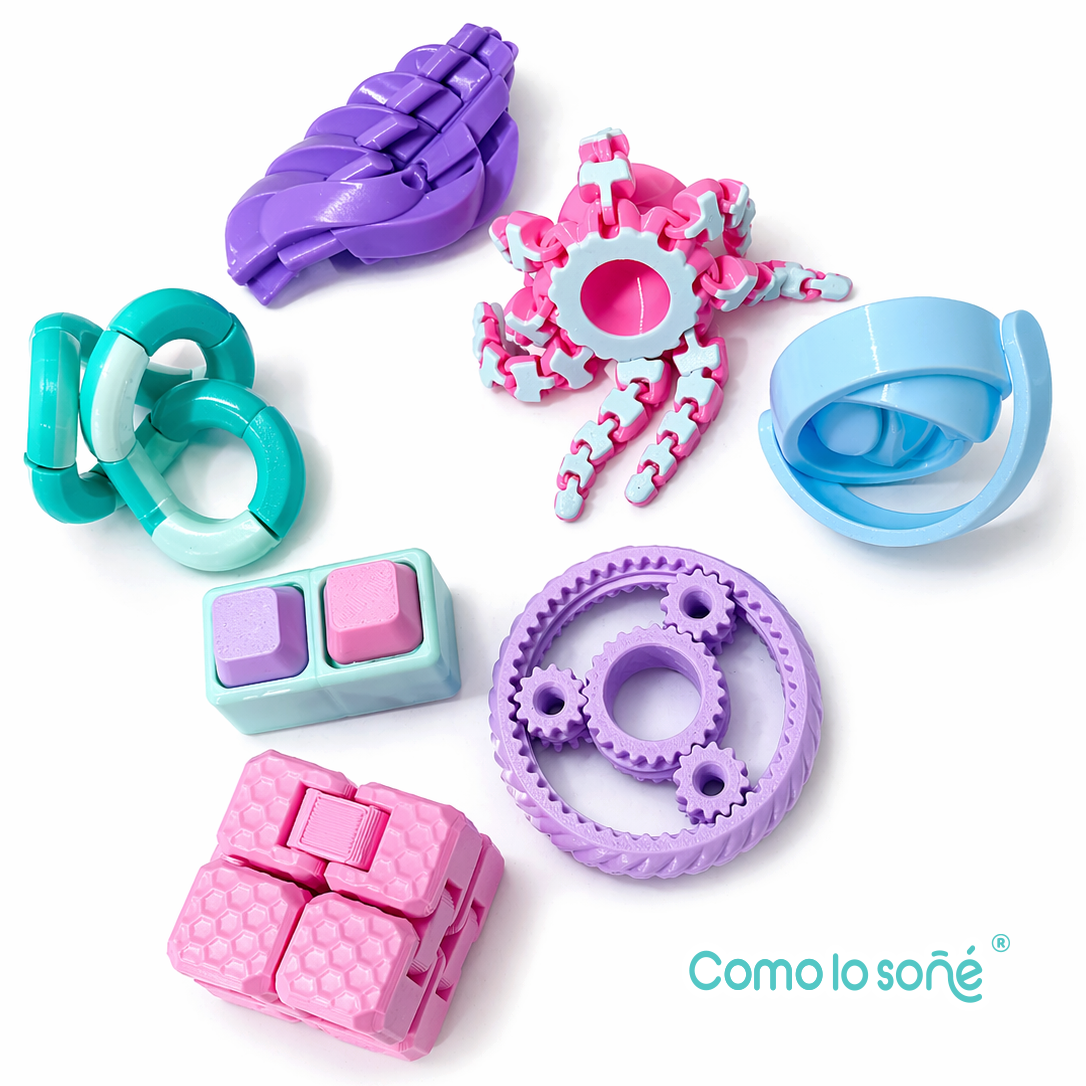 Un kit de juguetes sensoriales pensado para jugar, explorar texturas, concentrarse y relajarse de forma divertida. incluye 7 juguetes fidget Toys impresos en 3D.
