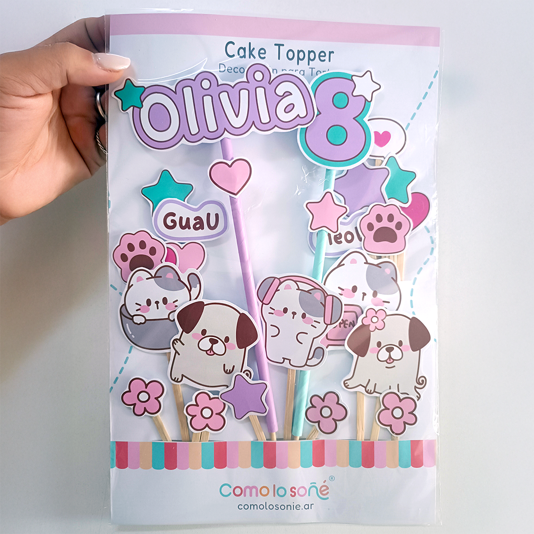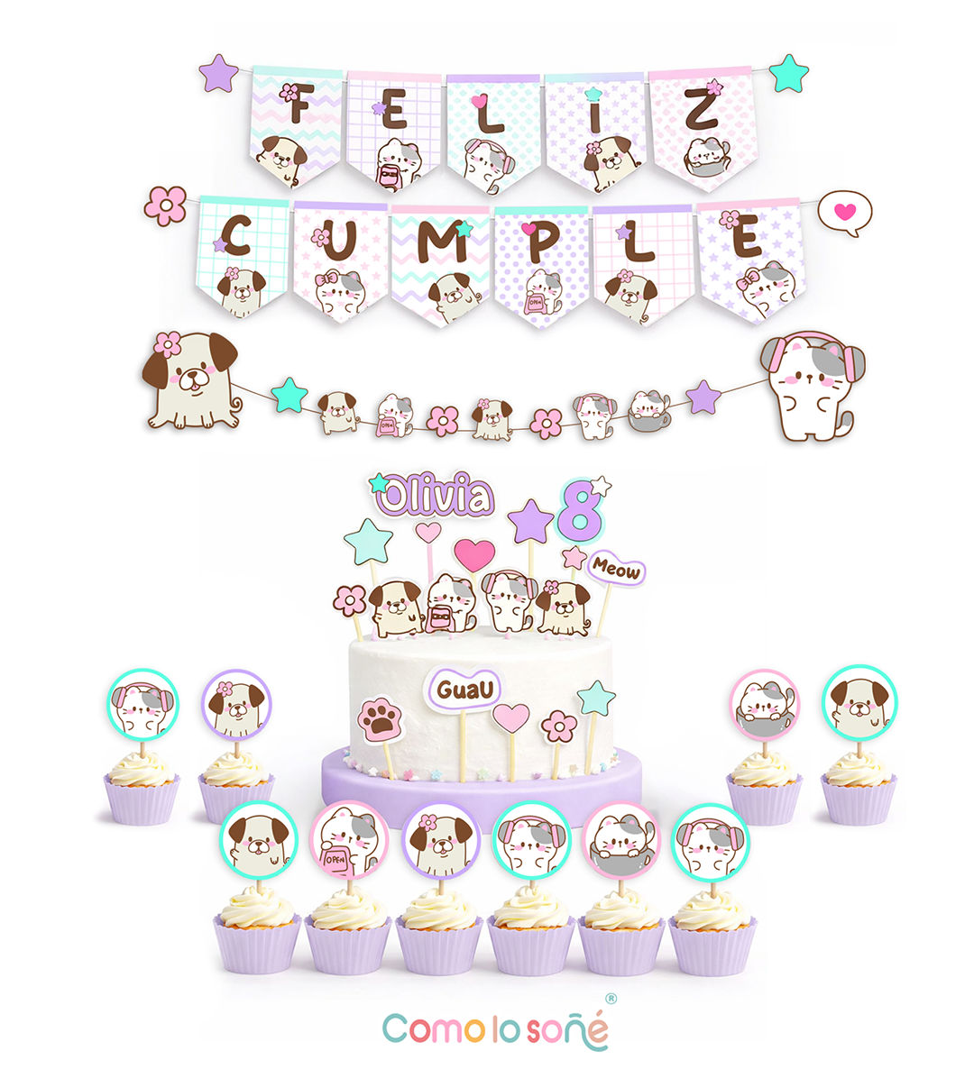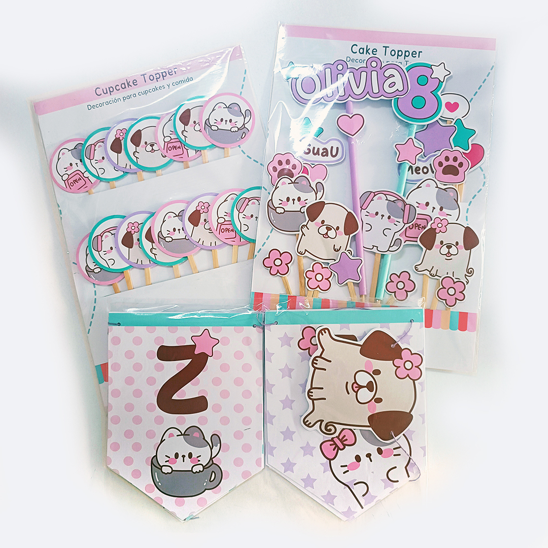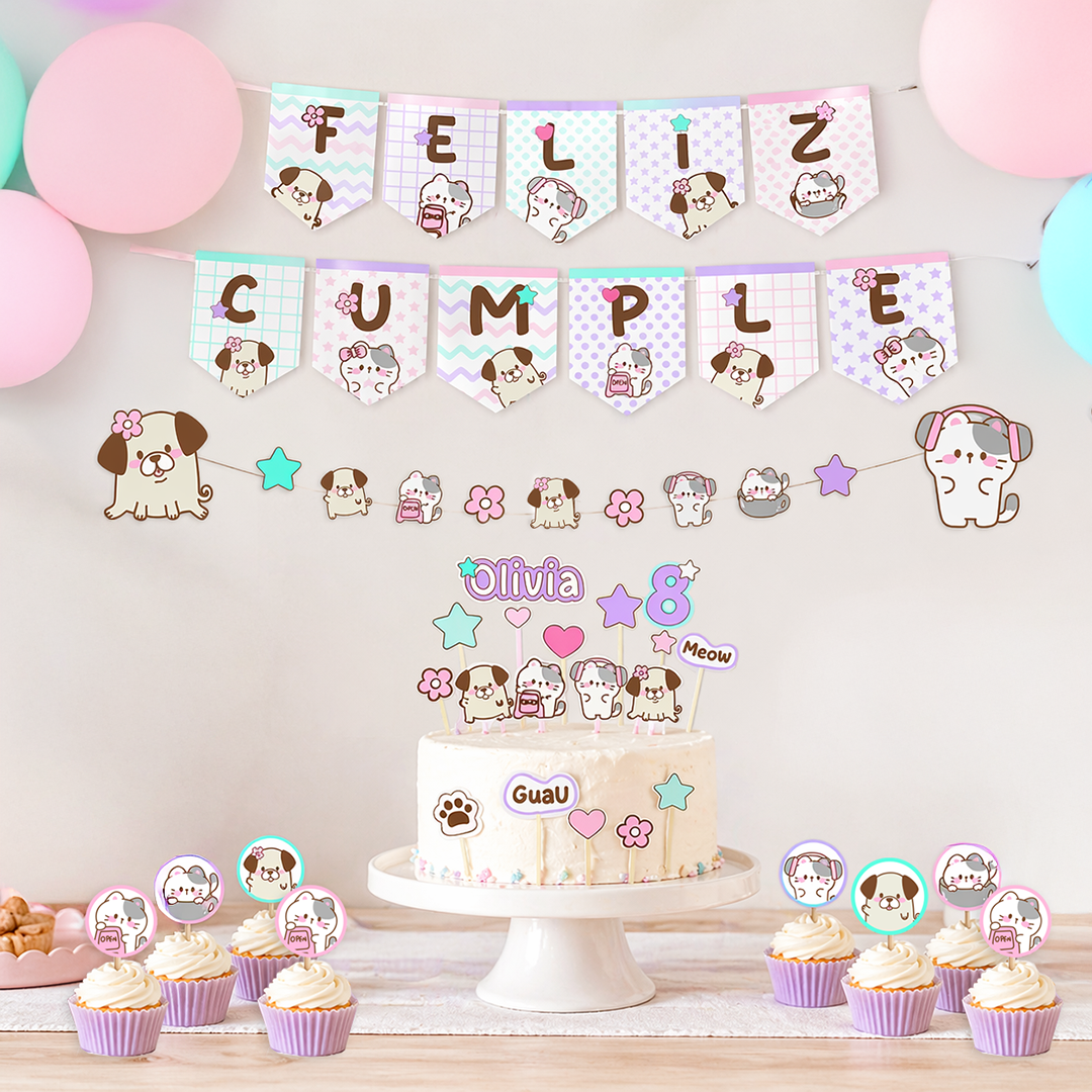 Kit Deco Cumpleaños Infantil Personalizado – Decoración Completa con Nombre – Temática: Gatitos y Perritos tiernos