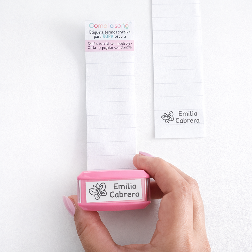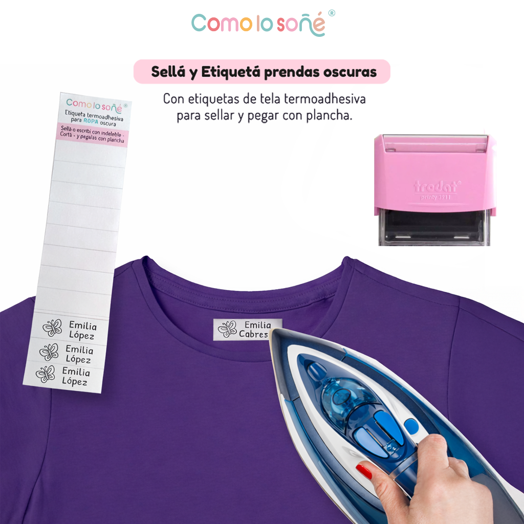 ✔️ Apto para telas de algodón y poliéster (en telas mixtas la fijación puede variar) En prendas oscuras, usar las etiquetas de tela termoadhesiva previamente sellada con el nombre y planchar.